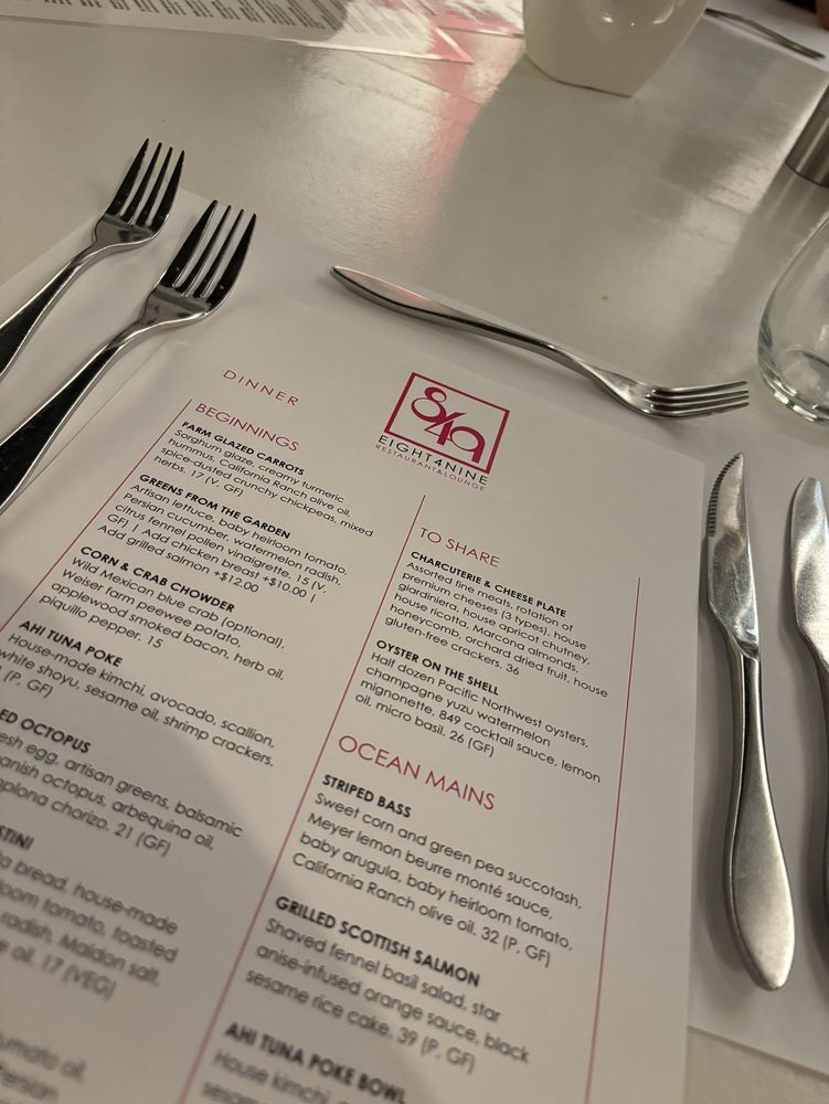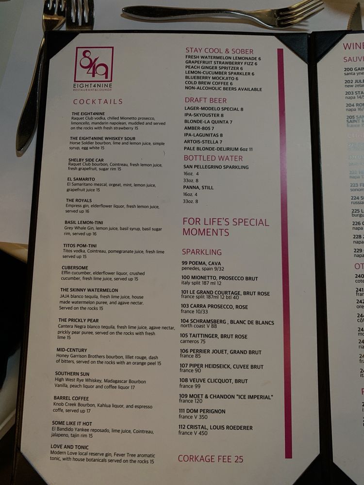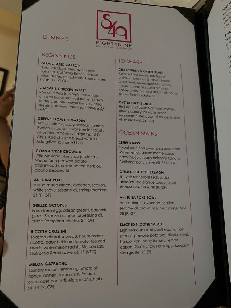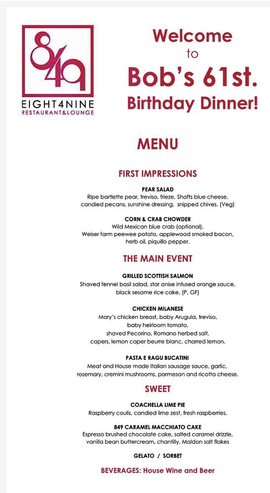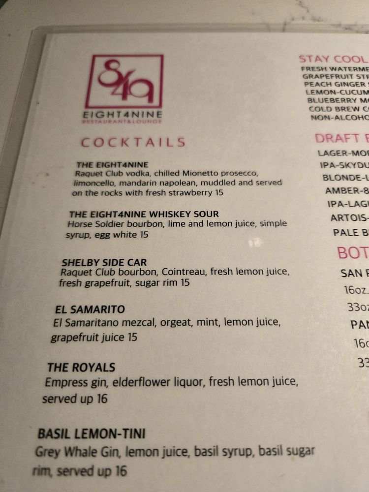 Introducing the menu at Eight4Nine in Palm Springs, a trendy lounge offering New American cuisine with a variety of options. This restaurant provides a vibrant atmosphere with ample seating, including outdoor and heated areas, perfect for any occasion. The menu features garden-fresh salads, flavorful burgers, and inventive mains like Poblano Chile Relleno and Cauliflower Steak. Customers rave about the attentive service and delicious food, with standout dishes like the Lobster Roll and Smoked Mushroom Pappardelle. The cocktail selection is also impressive, making it a great spot for Happy Hour specials. Whether you're looking for a casual meal or a special event catered to, Eight4Nine fits the bill with its diverse menu and inviting ambiance.